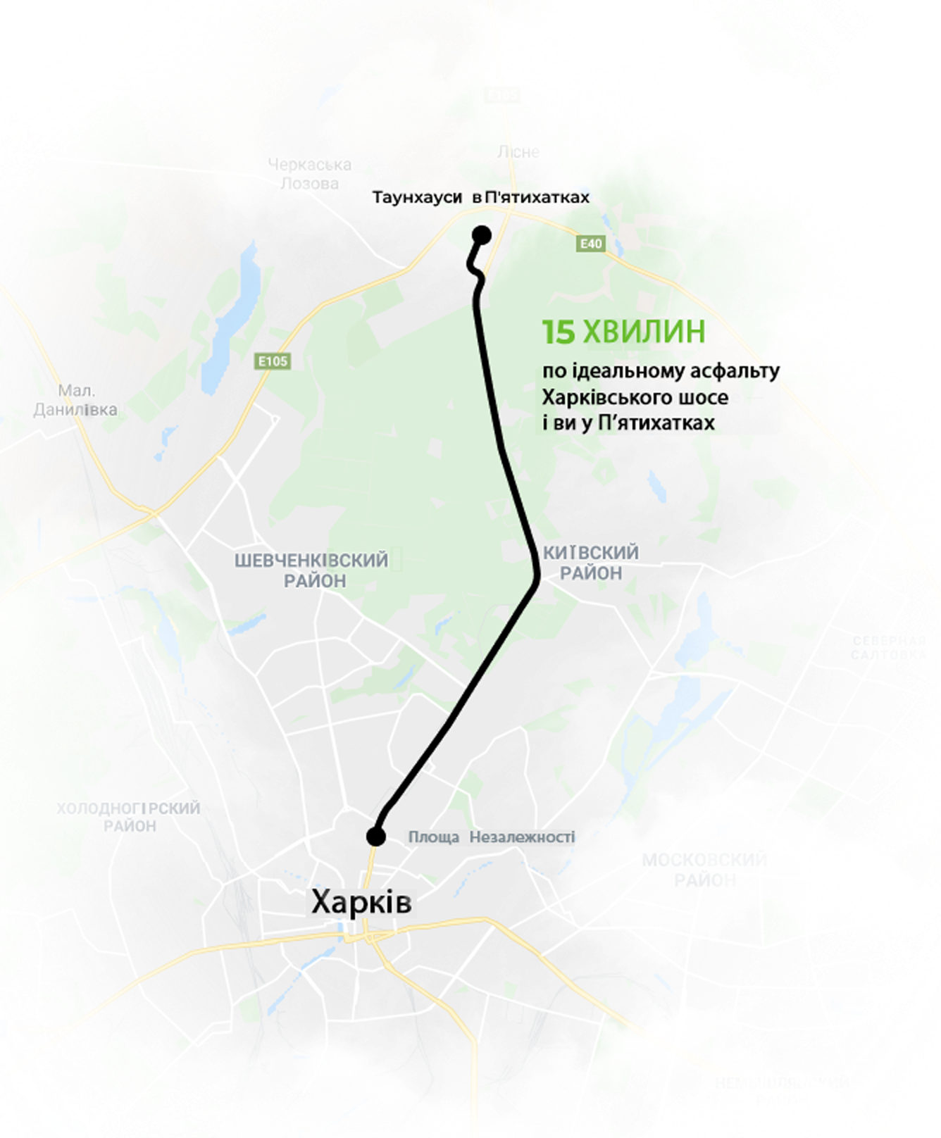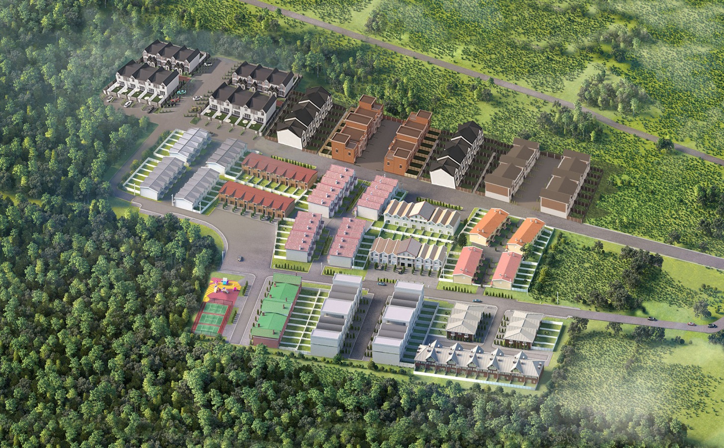 Комплекс Таунхаусов c 3-х сторон окружает лес - березовый и дубовый, но лишь тонкая полоса деревьев отделяет его от инфраструктуры жилого района Пятихатки.