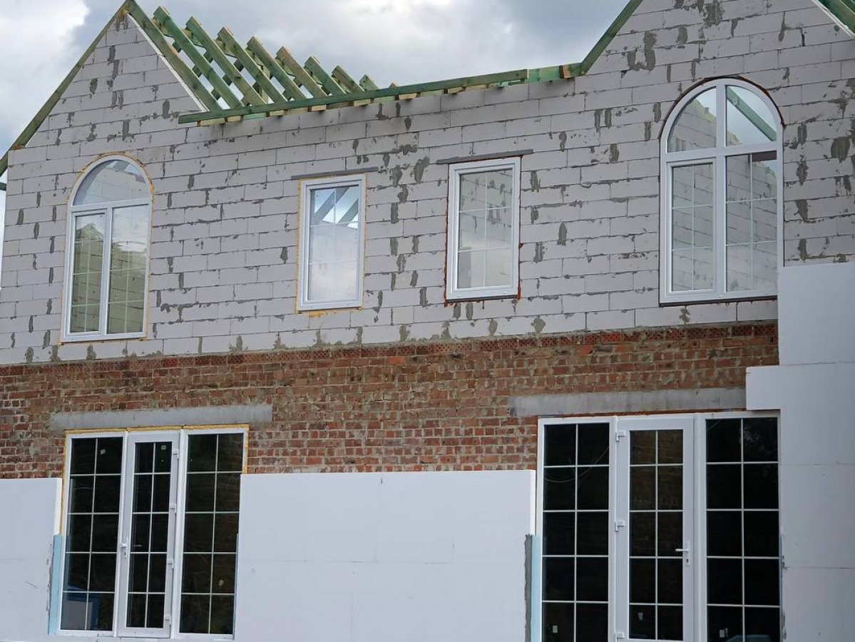 Первый этаж – красный кирпич кладкой в 1,5 кирпича (450 мм). Второй этаж – экологичный газобетон 300 мм.