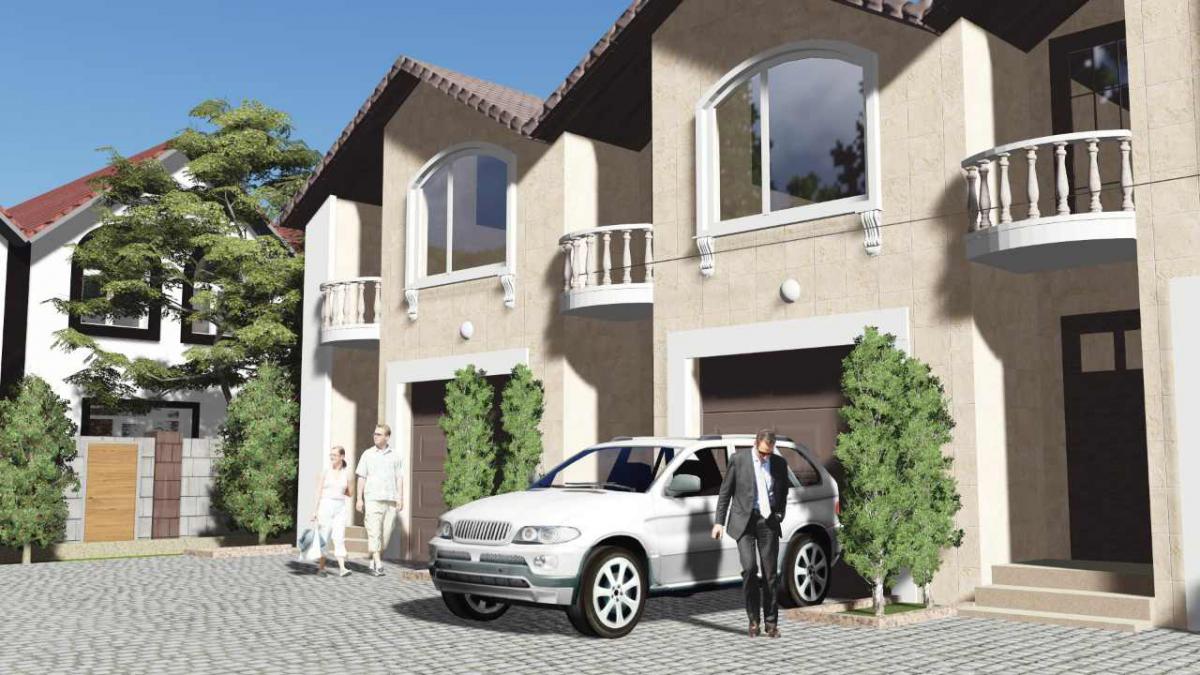 Таунхаус з найбільшою ділянкою землі. До стандартного 66м. кв додана бічна частина близько 120 м кв. Можна зробити навіс для другого автомобіля (не виступаючи за лінію фасаду). Є можливість зробити хвіртку із двору на вулицю.