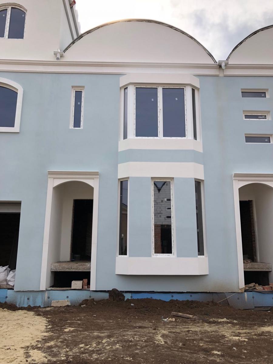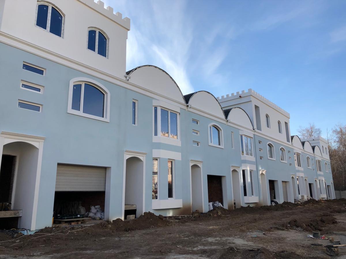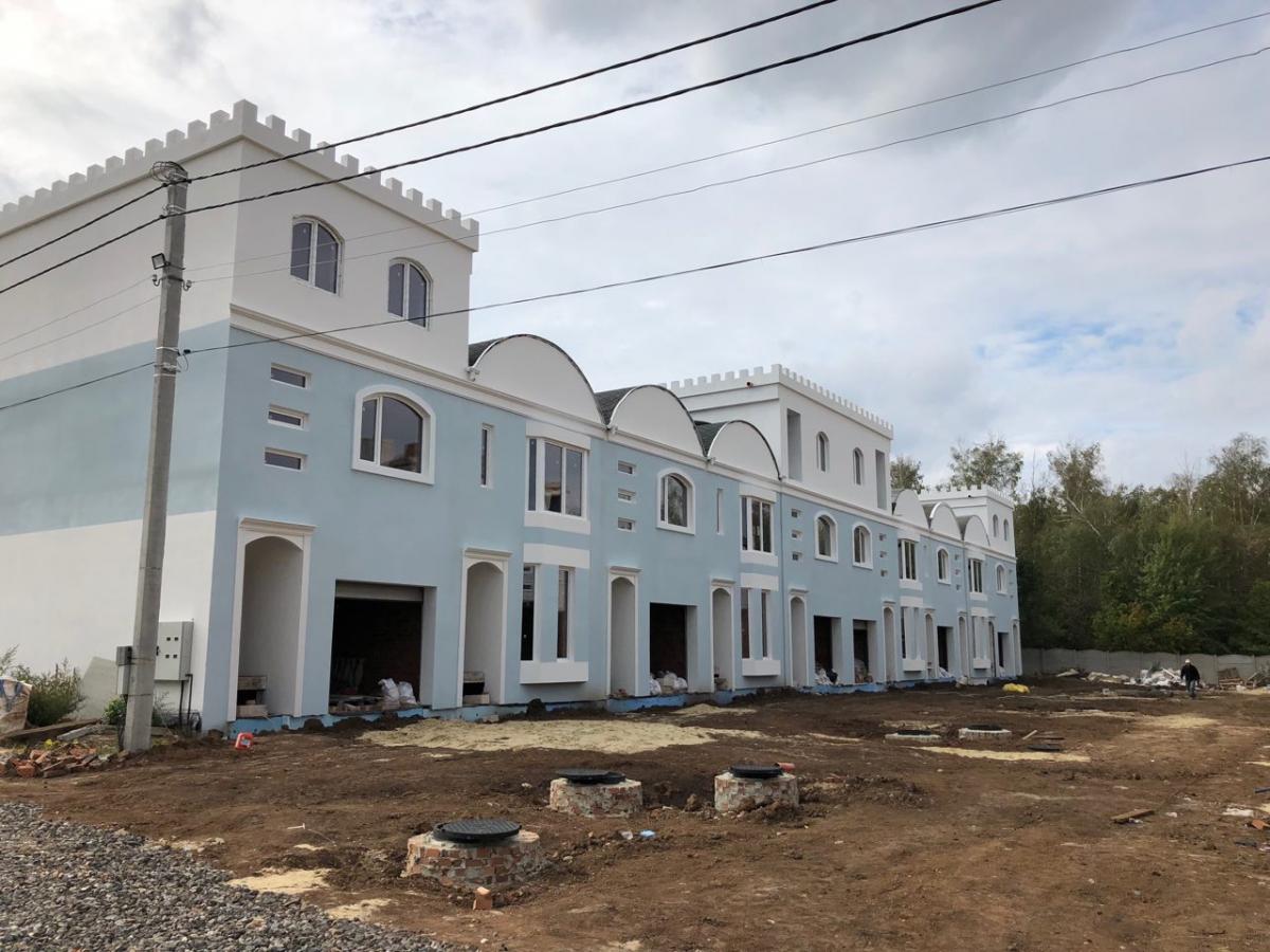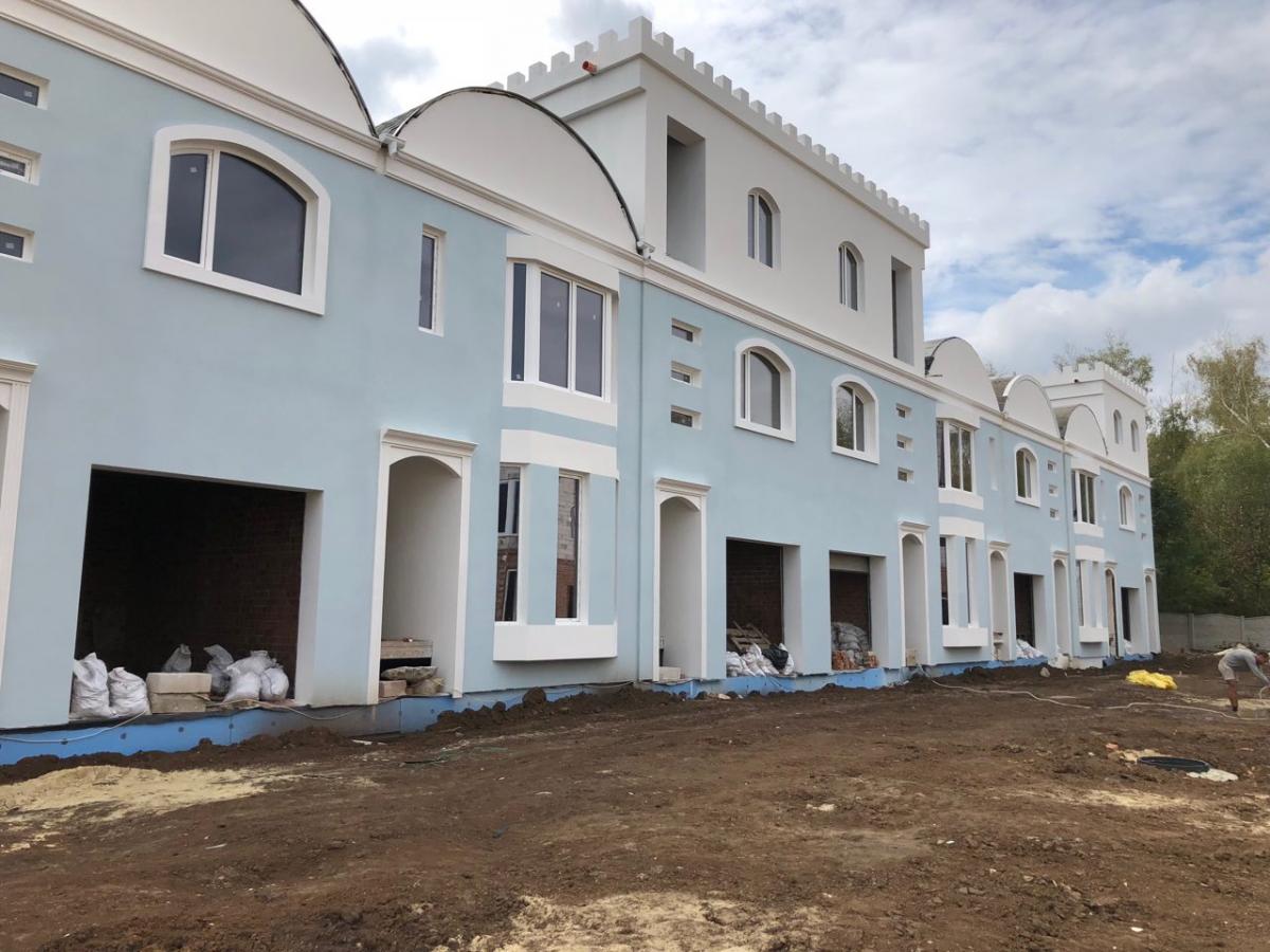 В Мароканских таунхаусах закончены фасадные работы, начались работы по отмосткам и выкладыванию улицы брусчаткой.