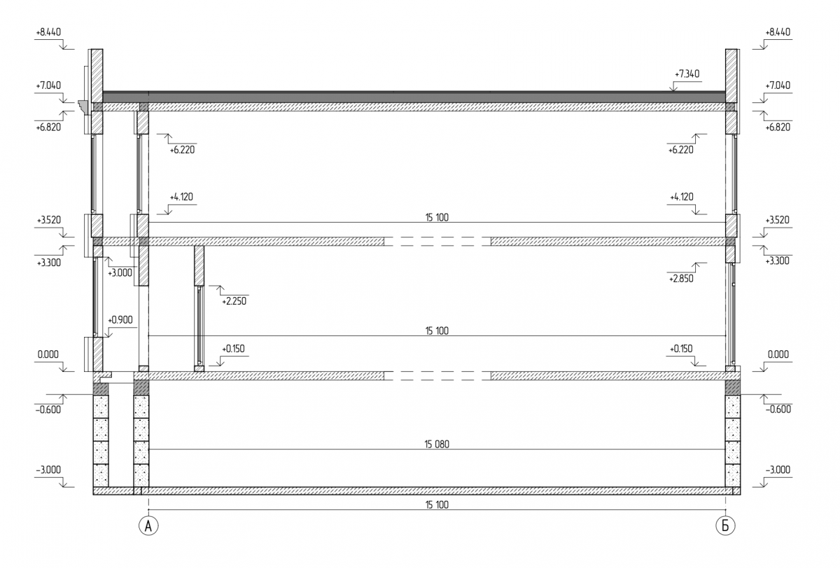 Збірно-монолітний фундамент. На дні котловану утрамбовується піщана подушка, вариться армований каркас і заливається єдиний на всю будівлю монолітний бетонний диск товщиною 220 мм. Потім бетонними блоками 400 мм викладаються стіни фундаменту. Із зовнішнього боку фундамент гідроізолюється мембраною і утеплюється пінополістирольними плитами 30 мм.